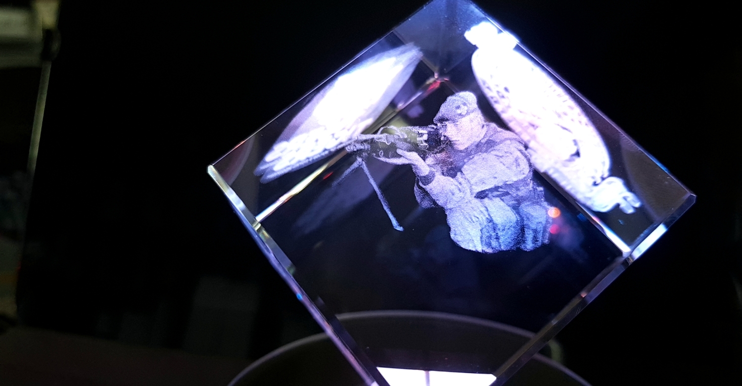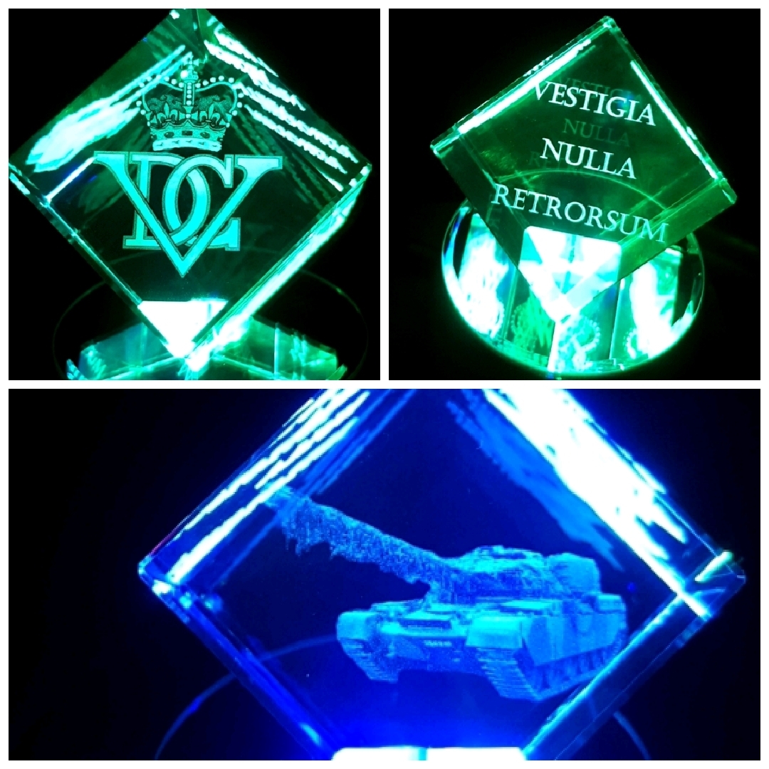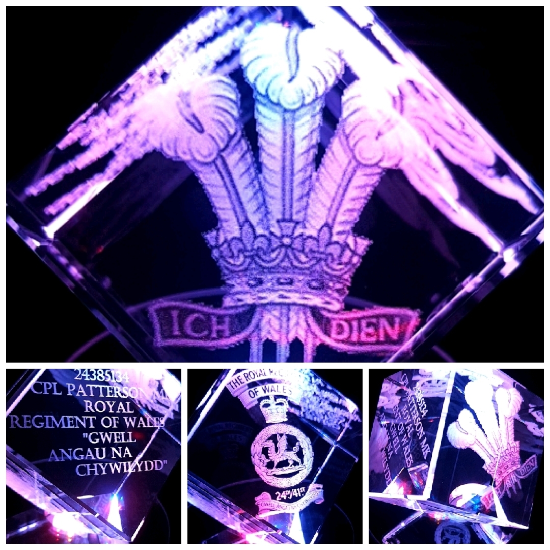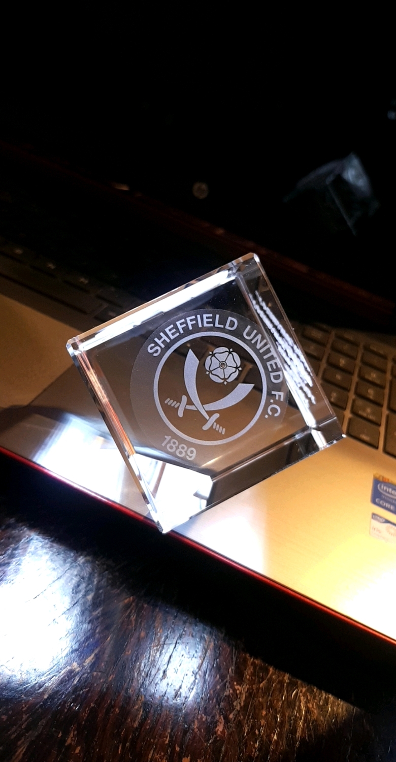 Stunning corner cut lead crystal cube, (Diamond) available for a centred image engraving or with 3 sides (with 1 optional) image.