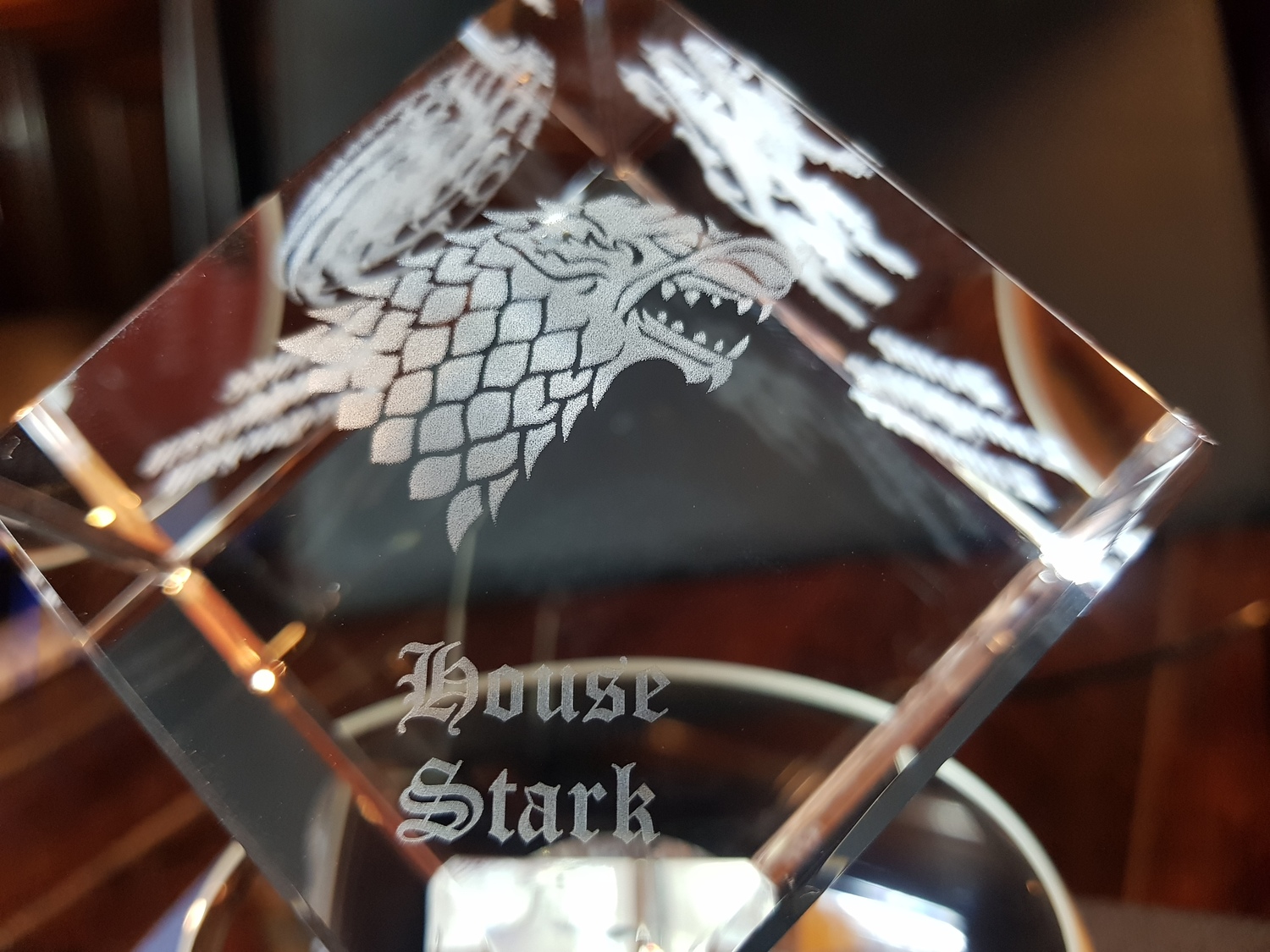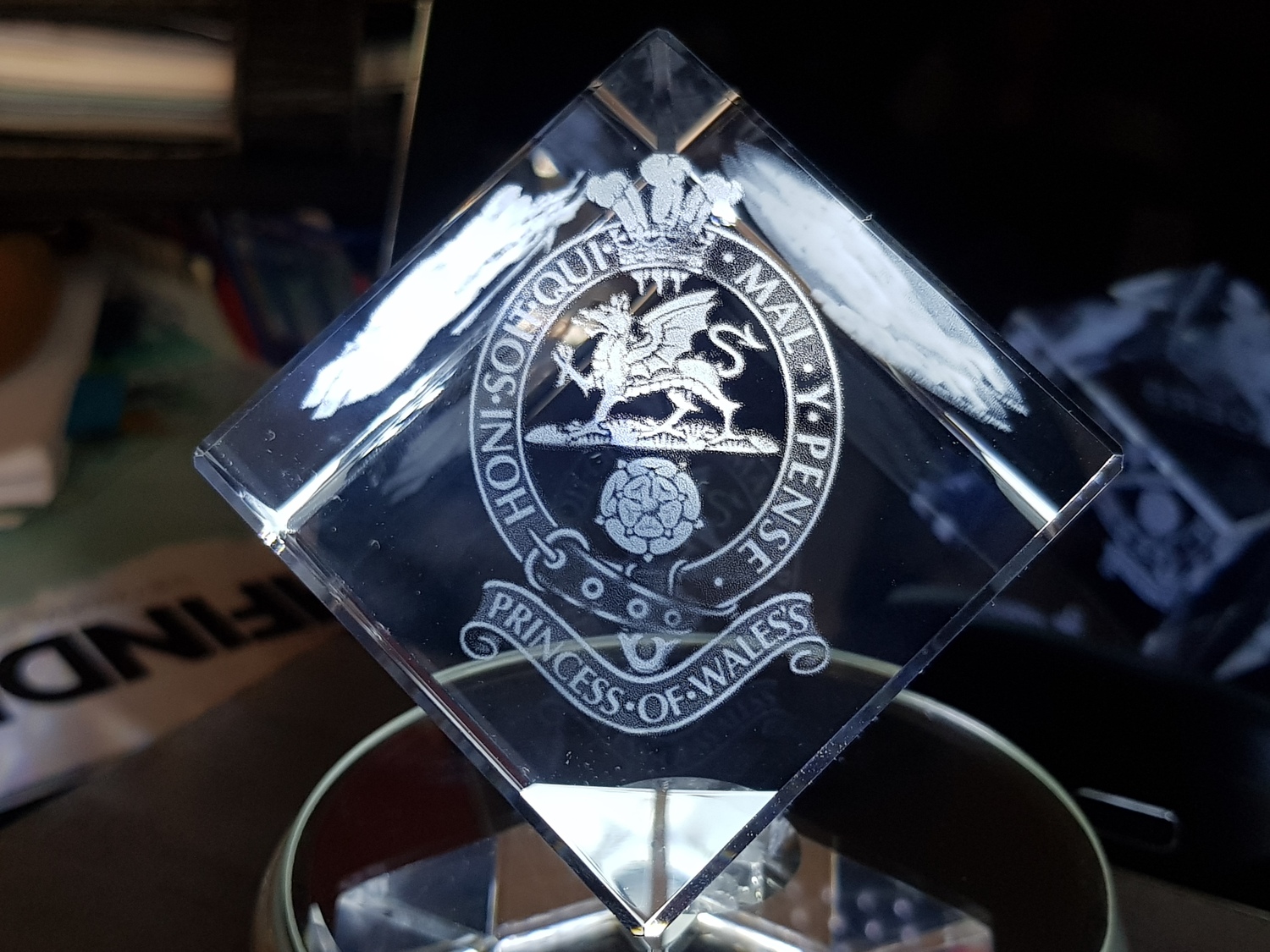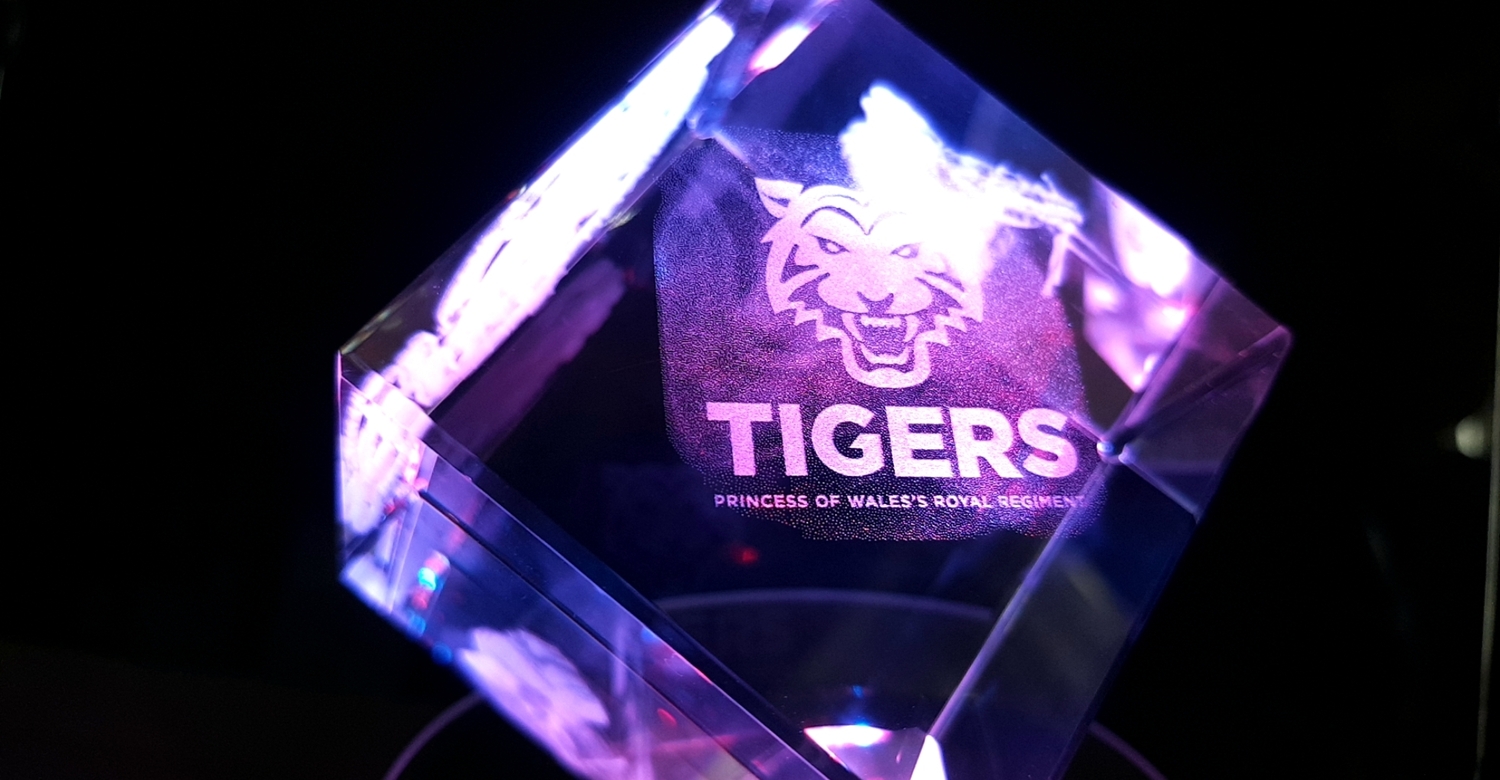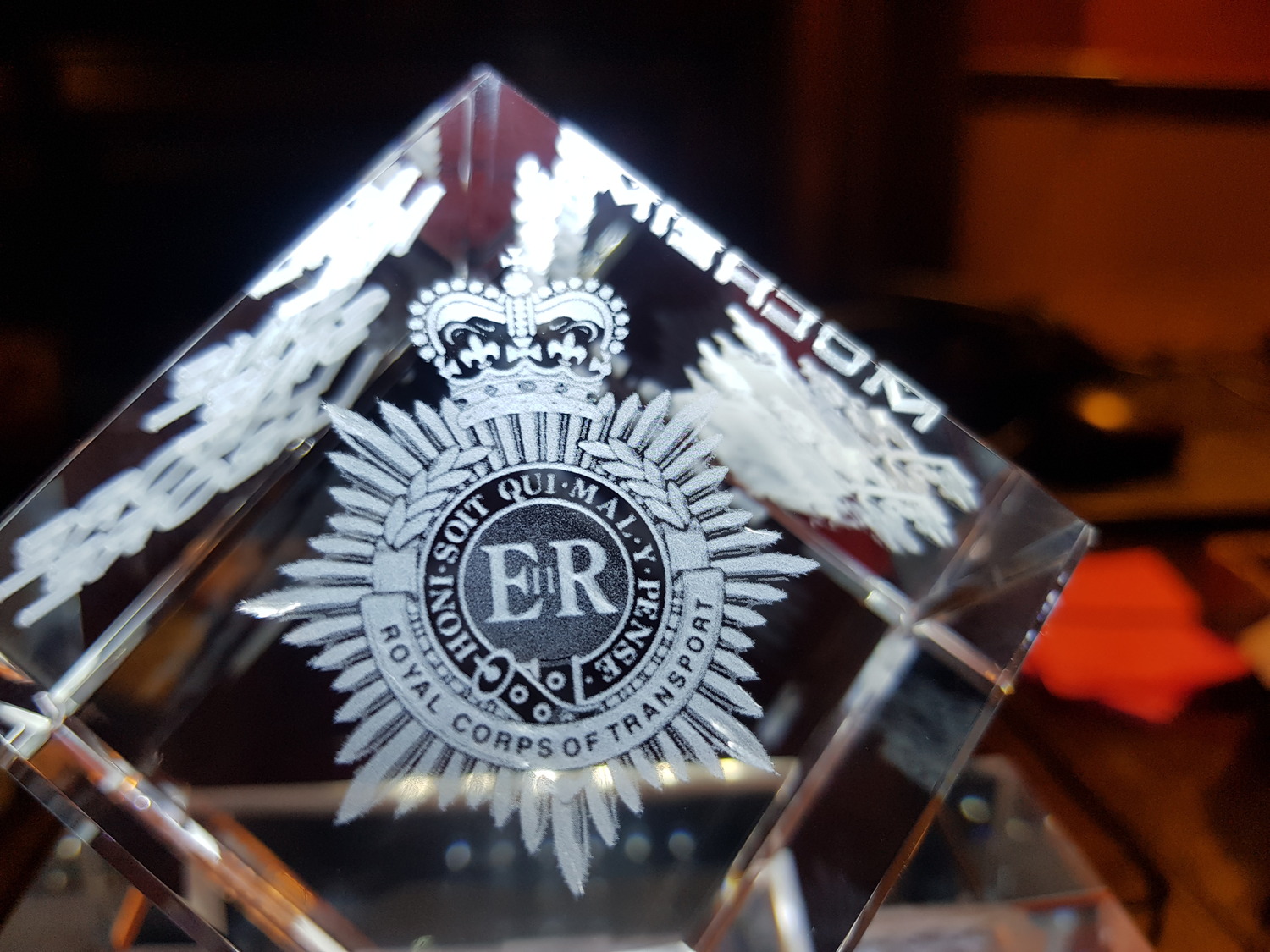 Stunning corner cut lead crystal cube, (Diamond) available for a centred image engraving or with 3 sides (with 1 optional) image.
